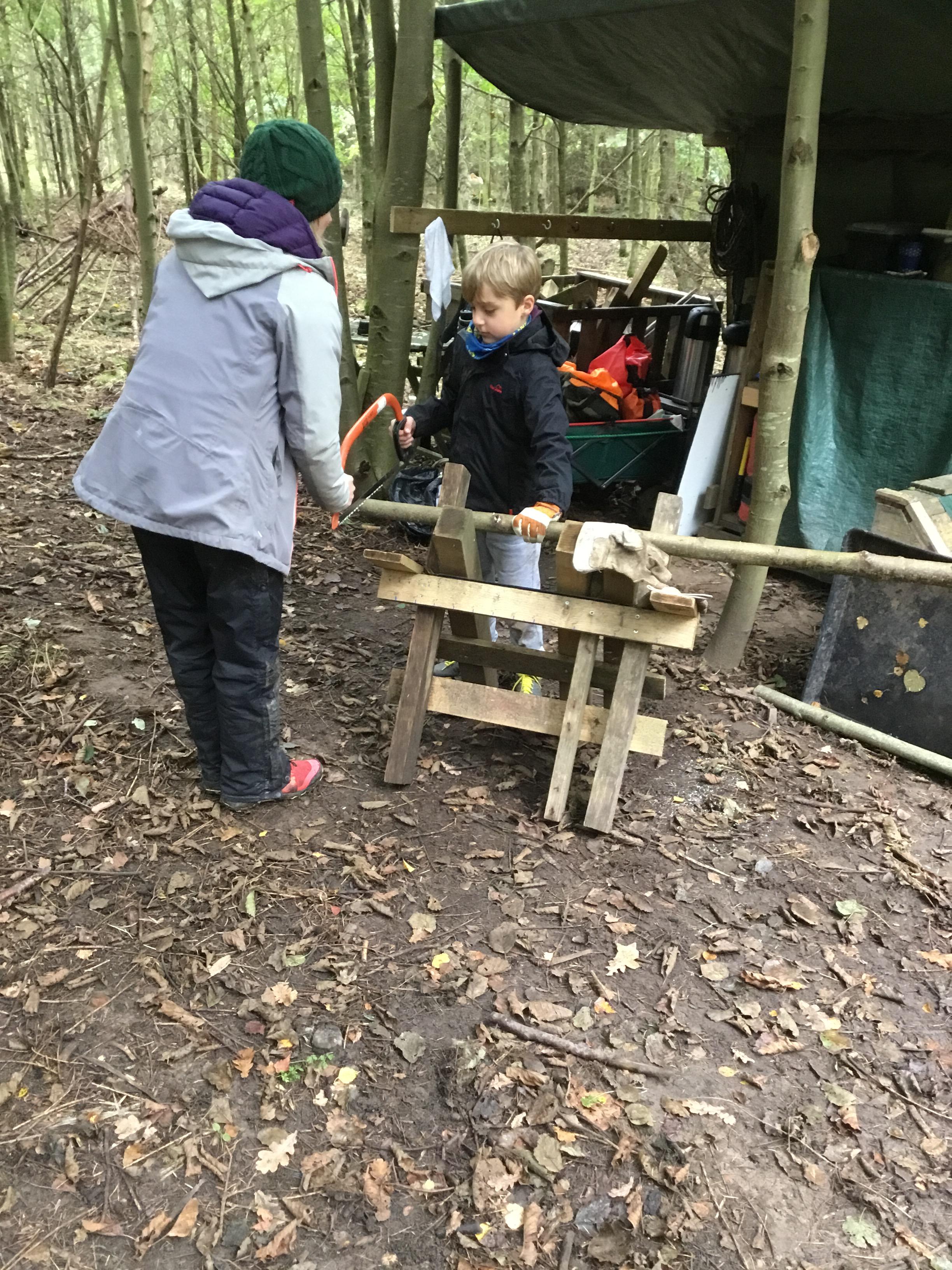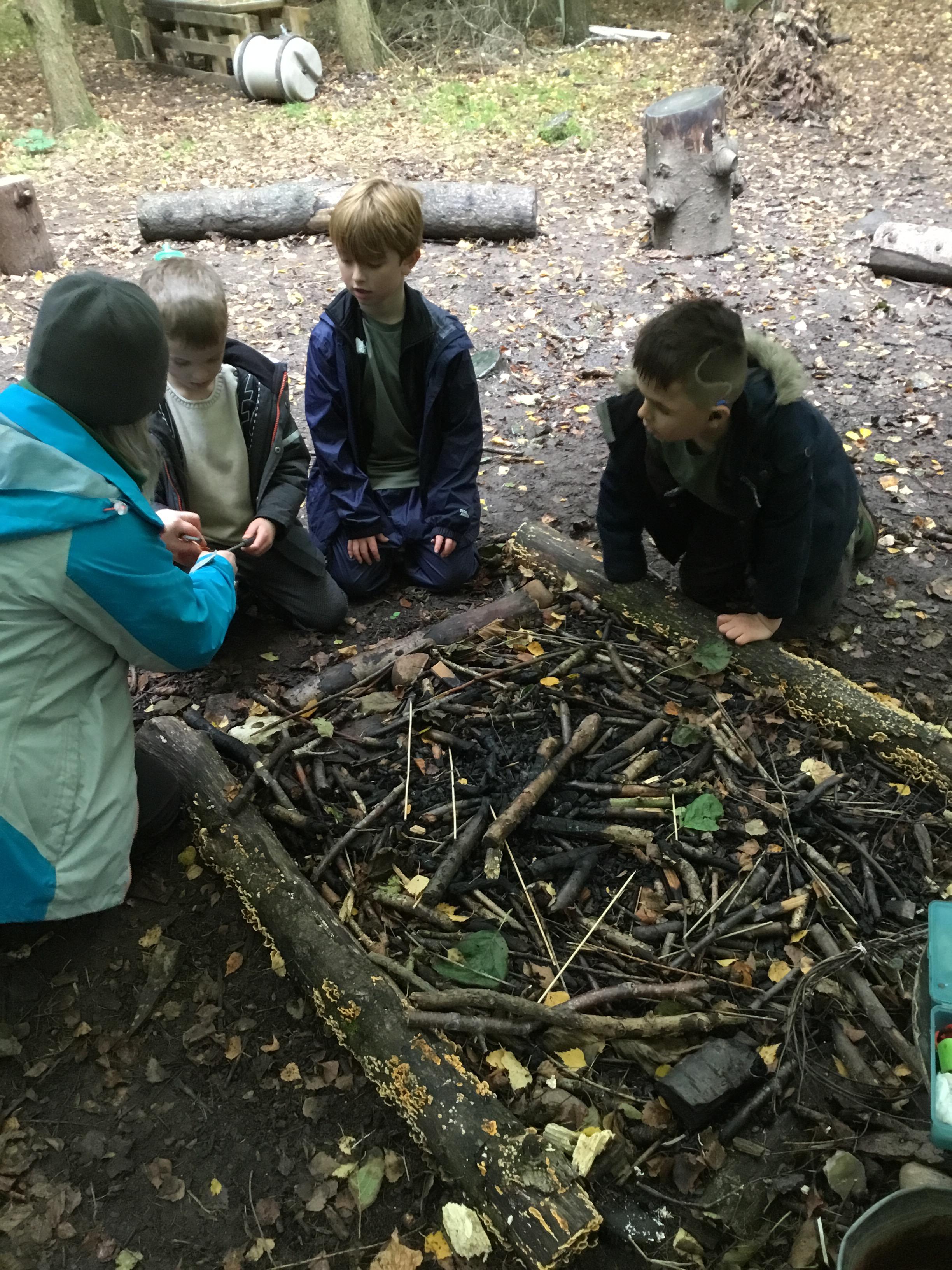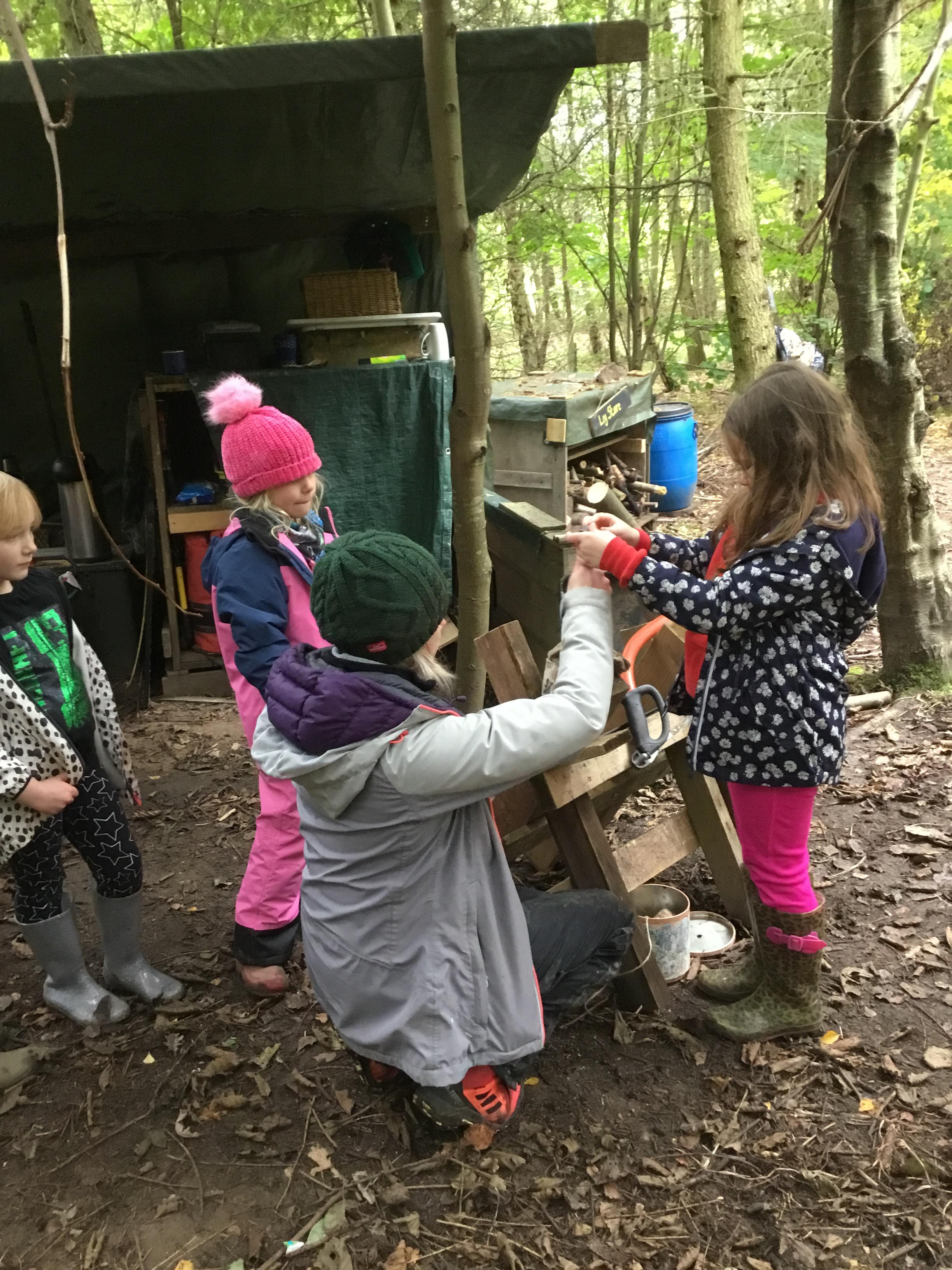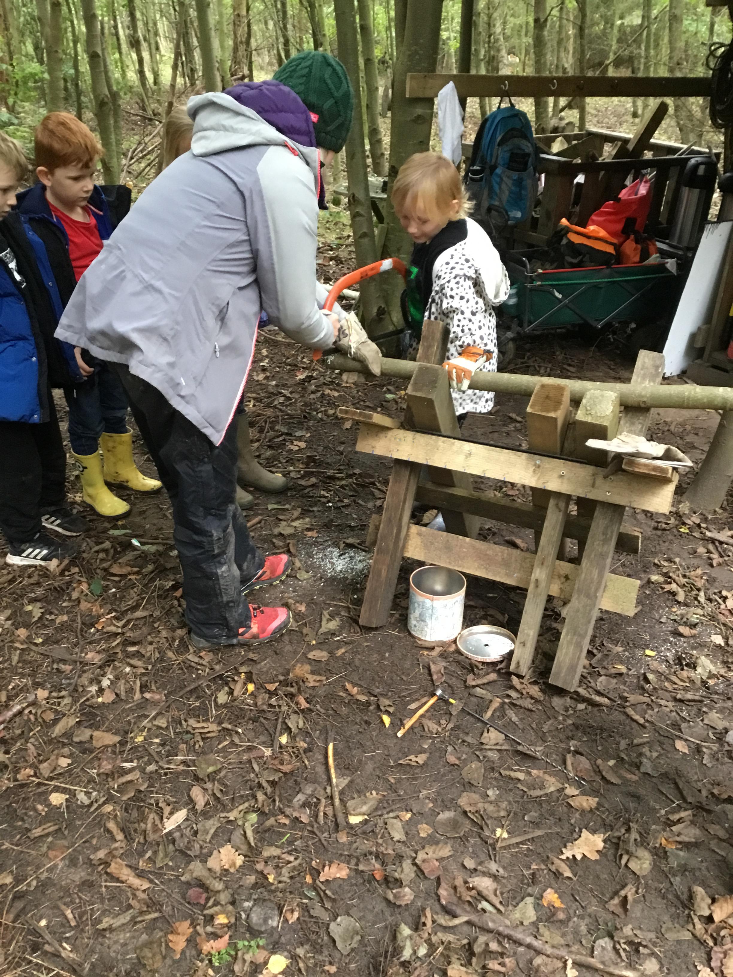 Everyone had a go at using flint and steel to start a fire. We cut slices of logs to make forest school medals.