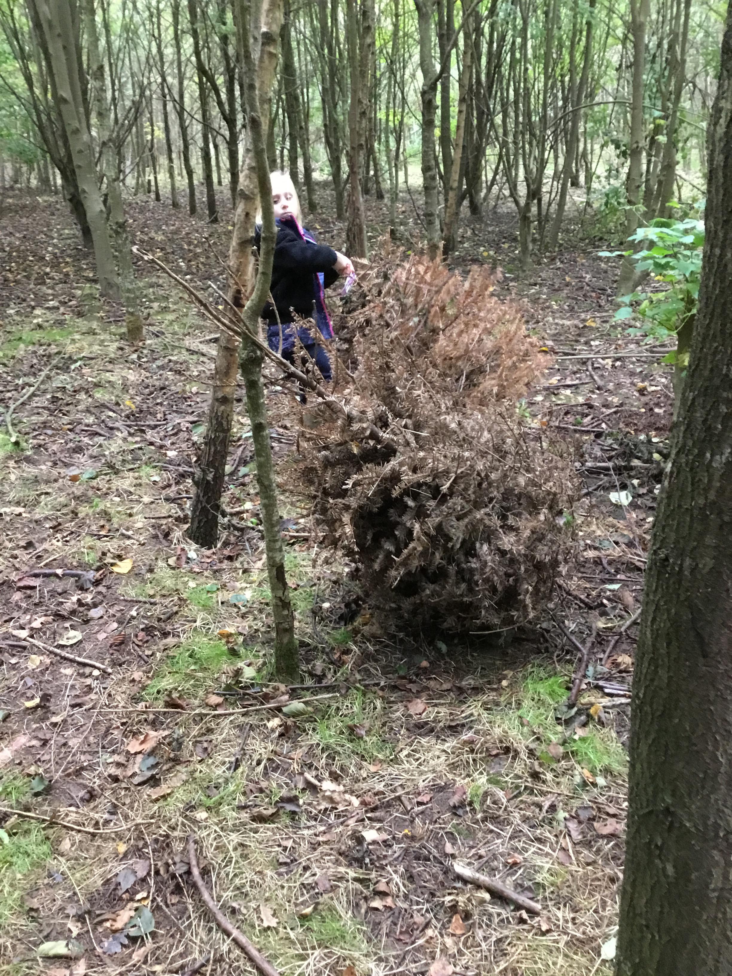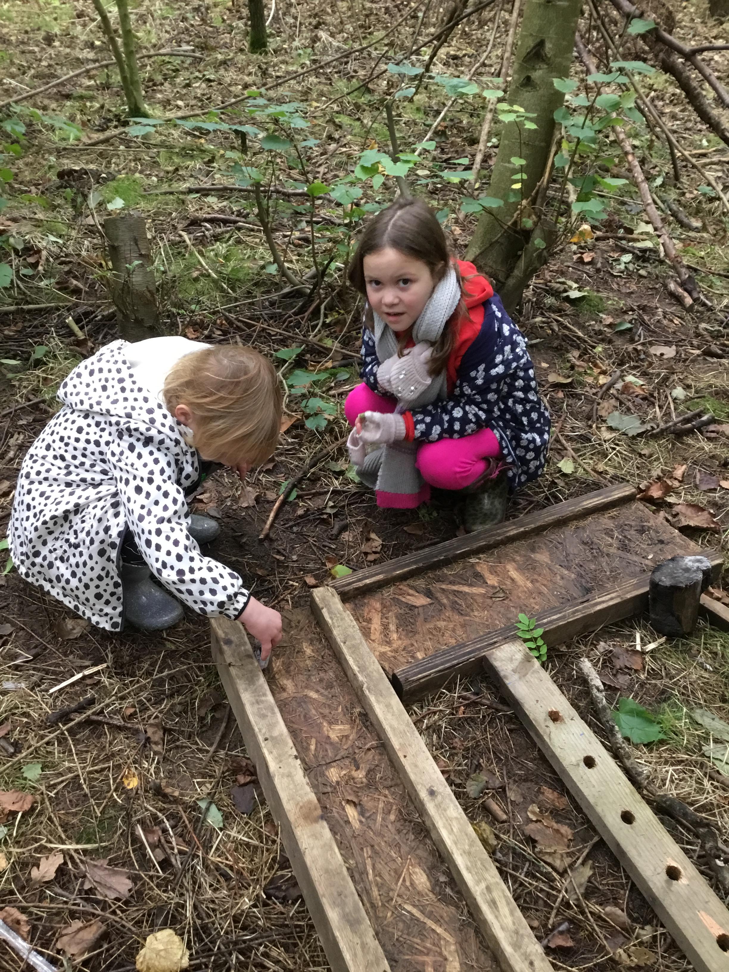 We built fairy houses using natural materials in the forest. We worked as a team to build the houses and move the heavy logs. Some of us built a home for a friendly dragon that lived in the forest.