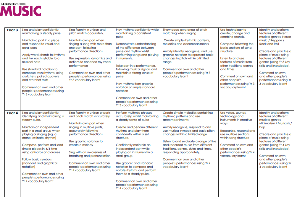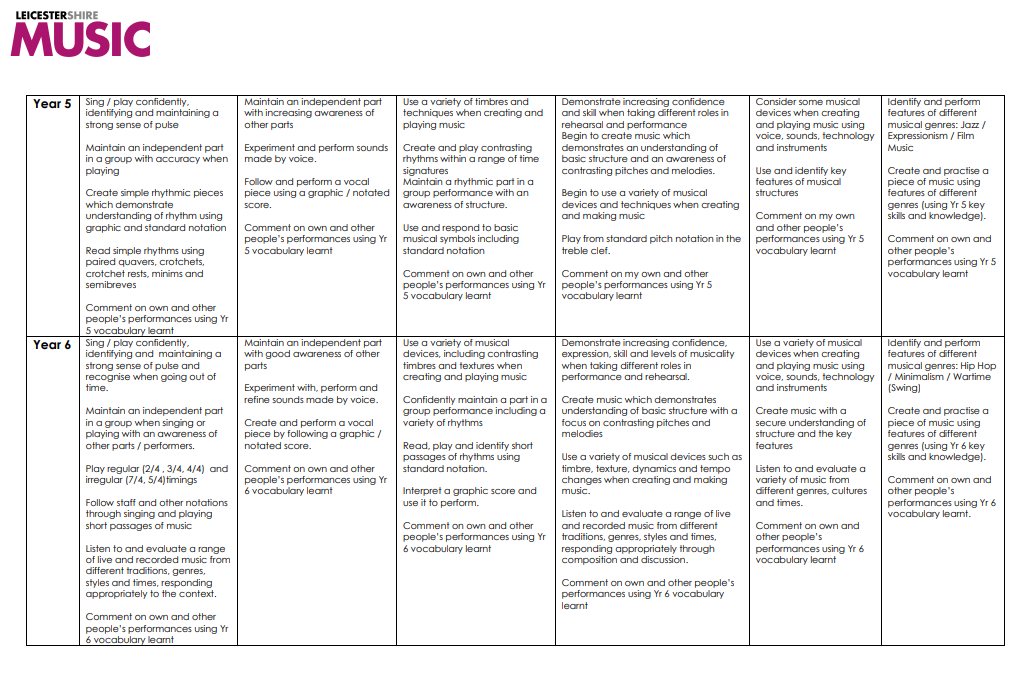 The expected impact of following the Leicestershire Music scheme of work is that children will develop a love of music whilst attaining the end-of-KS2 National Curriculum outcomes: