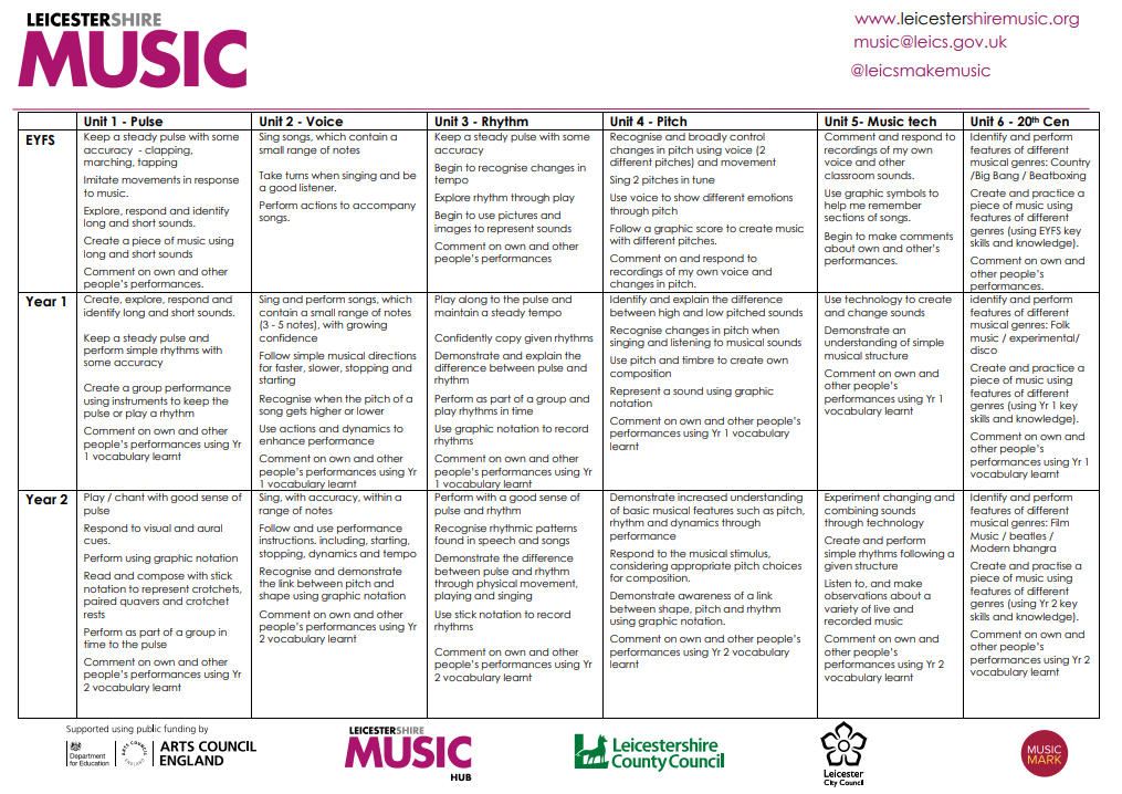 The Leicestershire Music scheme of work is designed to teach the content of the National Curriculum. This is achieved by developing the pupil's knowledge through six strands.